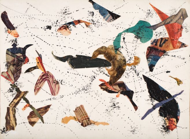 Réquichot choisit pour ses collages des papiers de couleur, découpés dans les magazines selon un contour visionné, et il répète le même motif assemblé selon le sentiment d’un espace en expansion et en suspension (comme celui des galaxies, que l’on voit immobiles quoi qu’on les sache en fuite). Les dimensions de ses collages, leur organisation, leurs images inédites, ont renouvelé radicalement l’esprit et les techniques du collage traditionnel. Ces morceaux de nature, organisés par une raison mariée à l’instinct, s’échappent de la mémoire, où leur signification diffère par d’autres voisinages…
