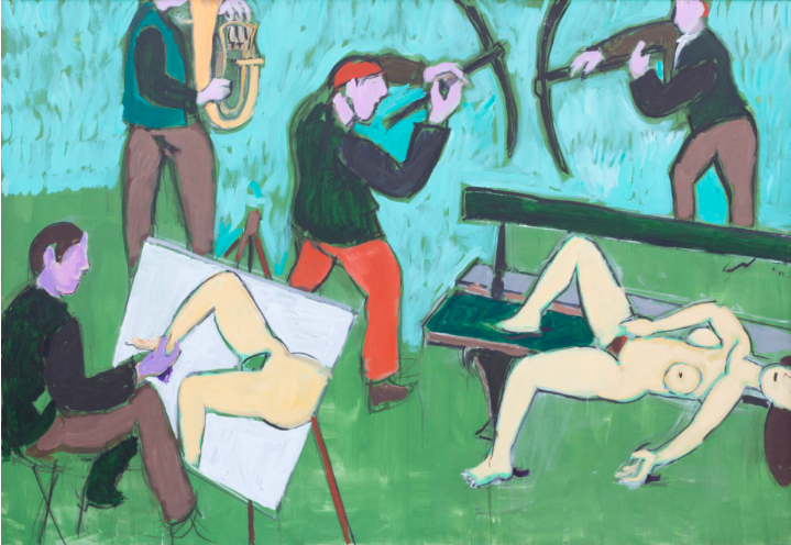 Hélion convertit ce qui pourrait être le plus lourd handicap pour un peintre, un déficit de vision croissant, en une audace esthétique. Les visages s’estompent, les relations entre les personnages deviennent l’essentiel. Le pouvoir de saisir l’ensemble est accru par le manque de celui de voir le détail, dira-t-il en 1982, quand il finit de perdre la vue.