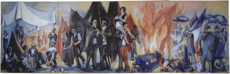 In the quarter-century after Grande mannequinerie Hélion explored the life of the city again and again. There is a large painting of figures in the Luxembourg Gardens, a series of works about butchers and butcher shops, groups of paintings devoted to people going in and out of the metro or gathered around a bookstall, and the three monumental triptychs, each close to thirty feet long: Triptyque du Dragon (The Rue du Dragon Triptych, 1967), Choses vues en mai (Things Seen in May, 1969; see illustration on page 18), and Jugement dernier des choses. When Hélion was working on Triptyque du Dragon, which depicts an ordinary afternoon on a little street on the Left Bank, he couldn’t have known that the upheavals of May 1968 would precipitate a second triptych, this one devoted to Paris as a site of protest. Together the two compose a vast diptych, a juxtaposition of the regular and altogether irregular dynamics of city life, although unfortunately at the Musée d’Art Moderne they aren’t shown together; Triptyque du Dragon is in the exhibition itself and Choses vues en mai is in the lobby.