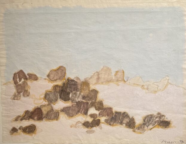 Pour Music, la terre est celle du plateau du Kartz de son enfance, aride, parsemée du rouille ferrugineux, rythmée de buissons noirs brûlés par le soleil ; celle des motifs végétaux où des racines calcinées, durcies, se mêlent à la terre. La pierre est celle des paysages rocheux, où affleurent parfois des crânes ; celle de la silhouette des Apennins, des murs de Venise, des cathédrales, des monts dalmates, des grottes suggérées par le caractère rupestre des Cavallini, l’éternelle naissance de ses Chevaux qui passent. Quand la brume apparaît, elle évoque la respiration d’une ville pariétale et aquatique, Venise.