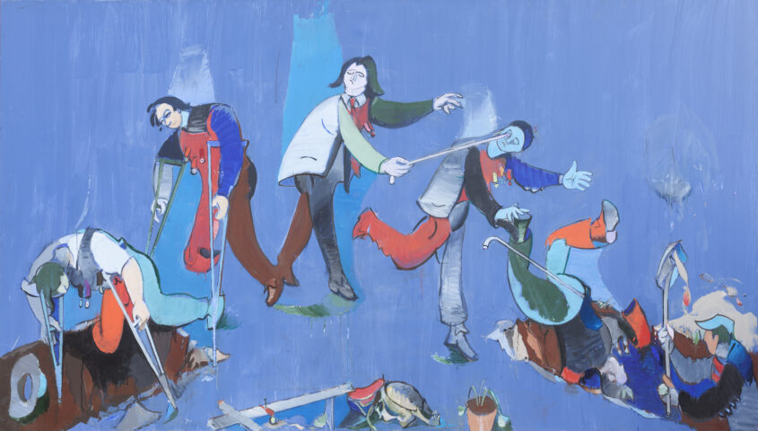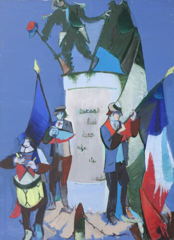 … En 1976, Hélion conçoit Suite pour le 11 novembre, en deux toiles accolées. L’une reprend la parabole des aveugles, dans la Bible, où un aveugle en conduit un autre, tous deux finissant par tomber dans une fosse. L’autre montre un monument aux morts avec drapeaux tricolores et tambour. Quatre noms sont inscrits sur le monument : Durand, Levi, Diop, Ngu . Ils sont suivi des mots « etc » et « De profundis ». La signification de l’œuvre est claire et on la découvre avec reconnaissance, aujourd’hui tout particulièrement.* |